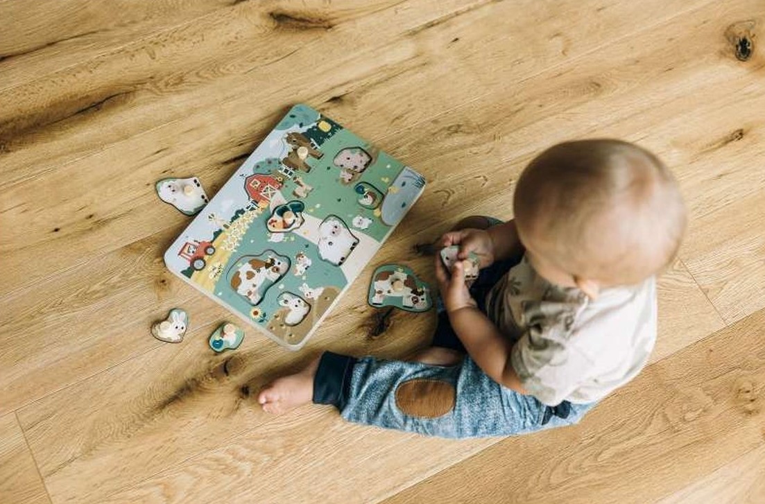 Na livadi se nalaze živahne domaće životinje koje se veselo glasaju. Dijete uči o životinjama i uči kako se glasaju. Drvena slagalica potiče djetetovu maštu, stimulira različita osjetila te potiče razvoj fine motorike i koordinacije oko-ruka.