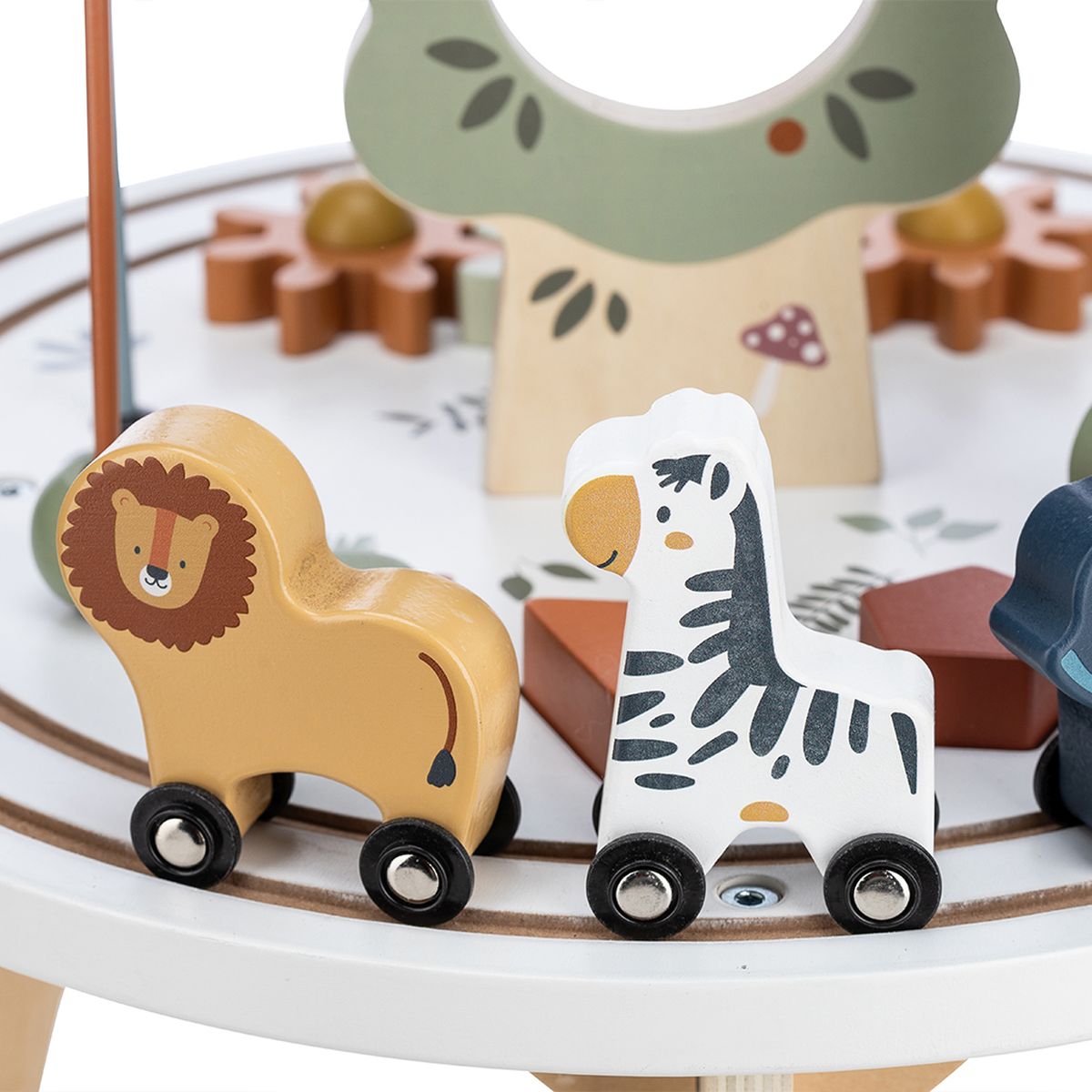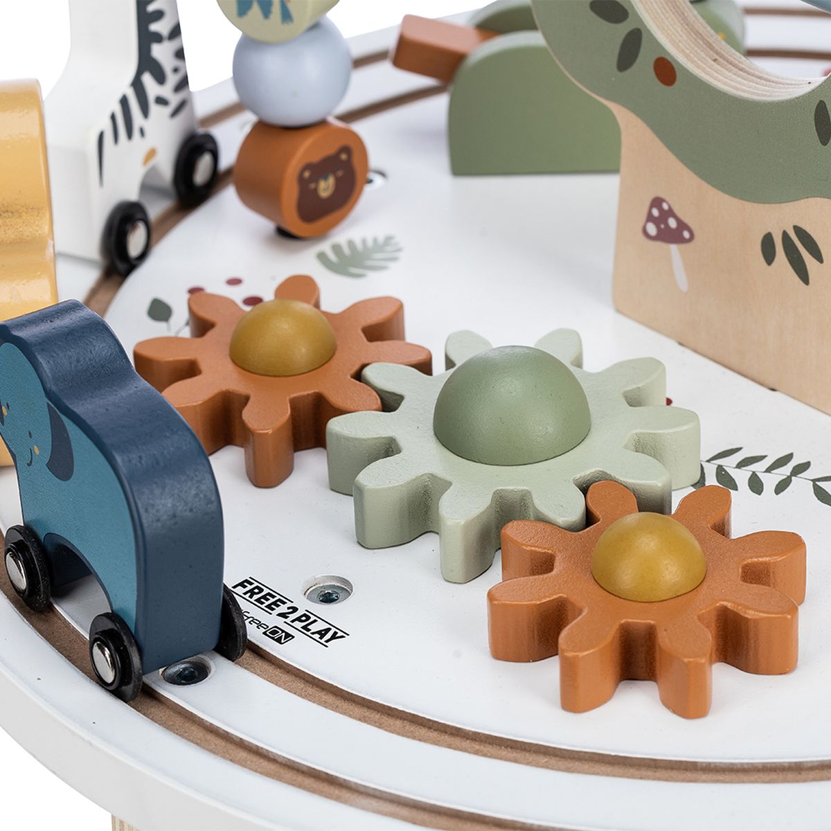 Free2Play interaktivni stol Think&Play odlična je aktivnost za vaše dijete. Stol je opremljen raznim elementima koji potiču i jačaju motoričke sposobnosti vašeg djeteta. S raznim rotirajućim oblicima i pokretnim životinjama, mališani će poboljšati svoje fine motoričke sposobnosti i koordinaciju ruku. Žirafa, lav i slon mogu se ukloniti sa stola i vaše dijete se može igrati s njima odvojeno. Labirint s raznim likovima potaknut će koncentraciju, logičko razmišljanje i rješavanje problema vašeg djeteta.