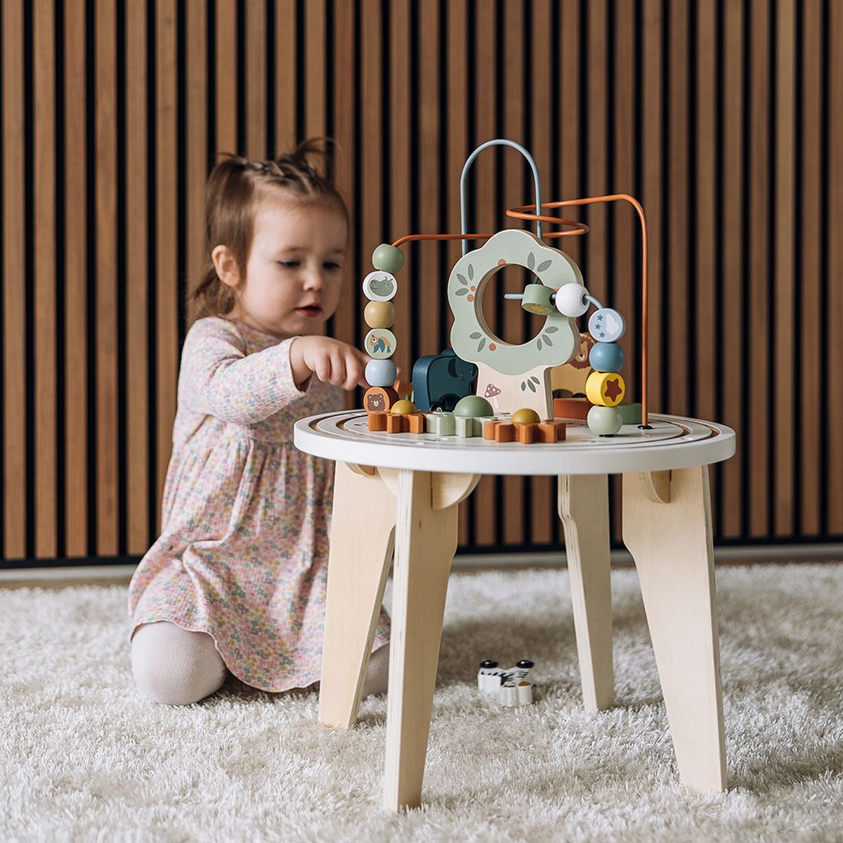 Stol također ima rotirajući mehanizam pomoću kojeg vaše dijete može razvijati prste, senzorne sposobnosti i finu motoriku. Osim toga, stol ima i mjesto za umetanje oblika, što potiče razumijevanje oblika, boja i vještine u rješavanju jednostavnih zagonetki. Atraktivne dječje boje stola privući će pažnju vašeg djeteta i potaknuti njegovu znatiželju. Stol je visok 31,5 cm (58 cm s igračkama) i ima promjer od 40 cm. Možete ga postaviti na pod ili na odgovarajući stol, što omogućuje fleksibilnost prema željama i potrebama vašeg djeteta.