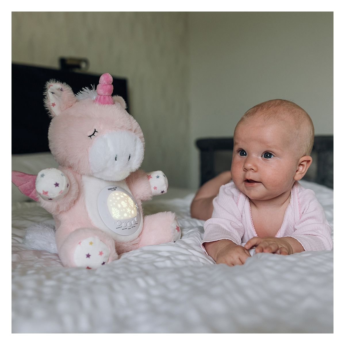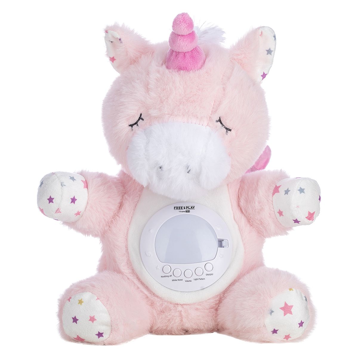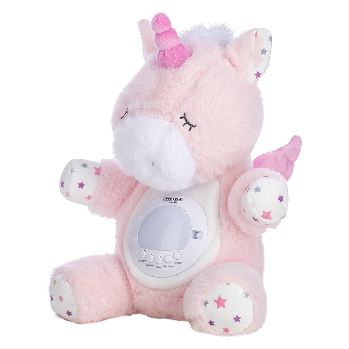 Free2Play Jednorog s pomičnom glavom, glazbom i projekcijom odličan je dodatak koji će stvoriti ugodnu i mirnu atmosferu za vašeg mališana prije spavanja. Mekani plišani prijatelj nježno će pratiti dijete u svijet snova laganim klimanjem glave. Gledajući nježnu projekciju i slušajući ugodnu melodiju, vaš mališan će se smiriti i zaspati. Mekani, nježni plišani prijatelj sa 7 načina projekcije, 60 uspavanki, 6 bijelih šumova, 5 podesivih razina glasnoće. Uključena su 3 poklopca koje će stvarati različite svjetlosne projekcije (zvjezdano nebo, ocean, noćno svjetlo).