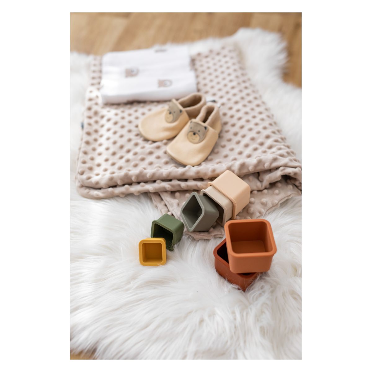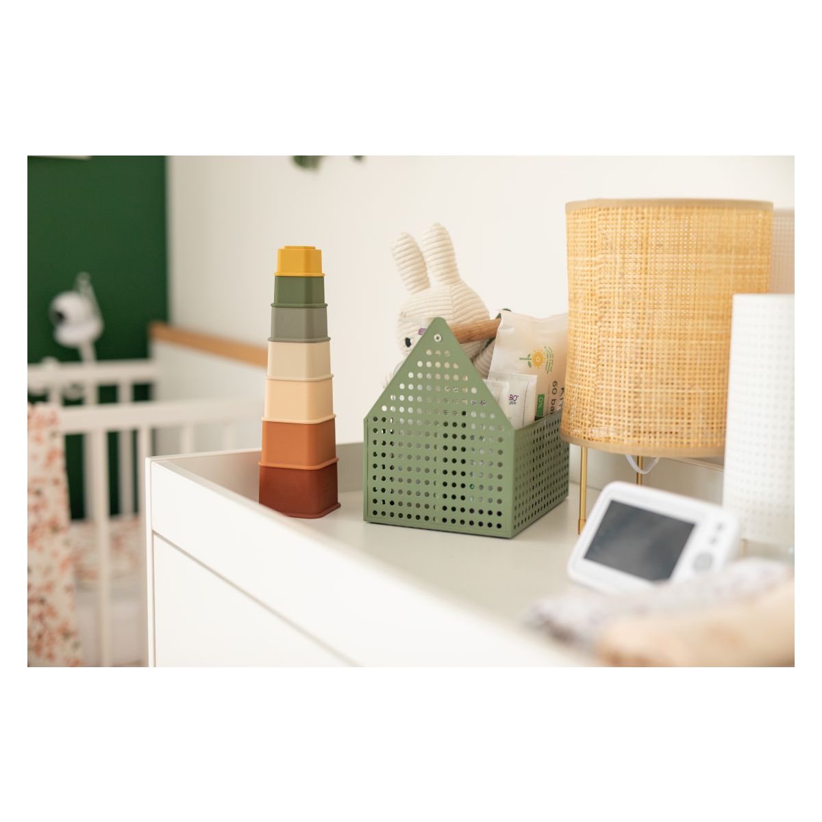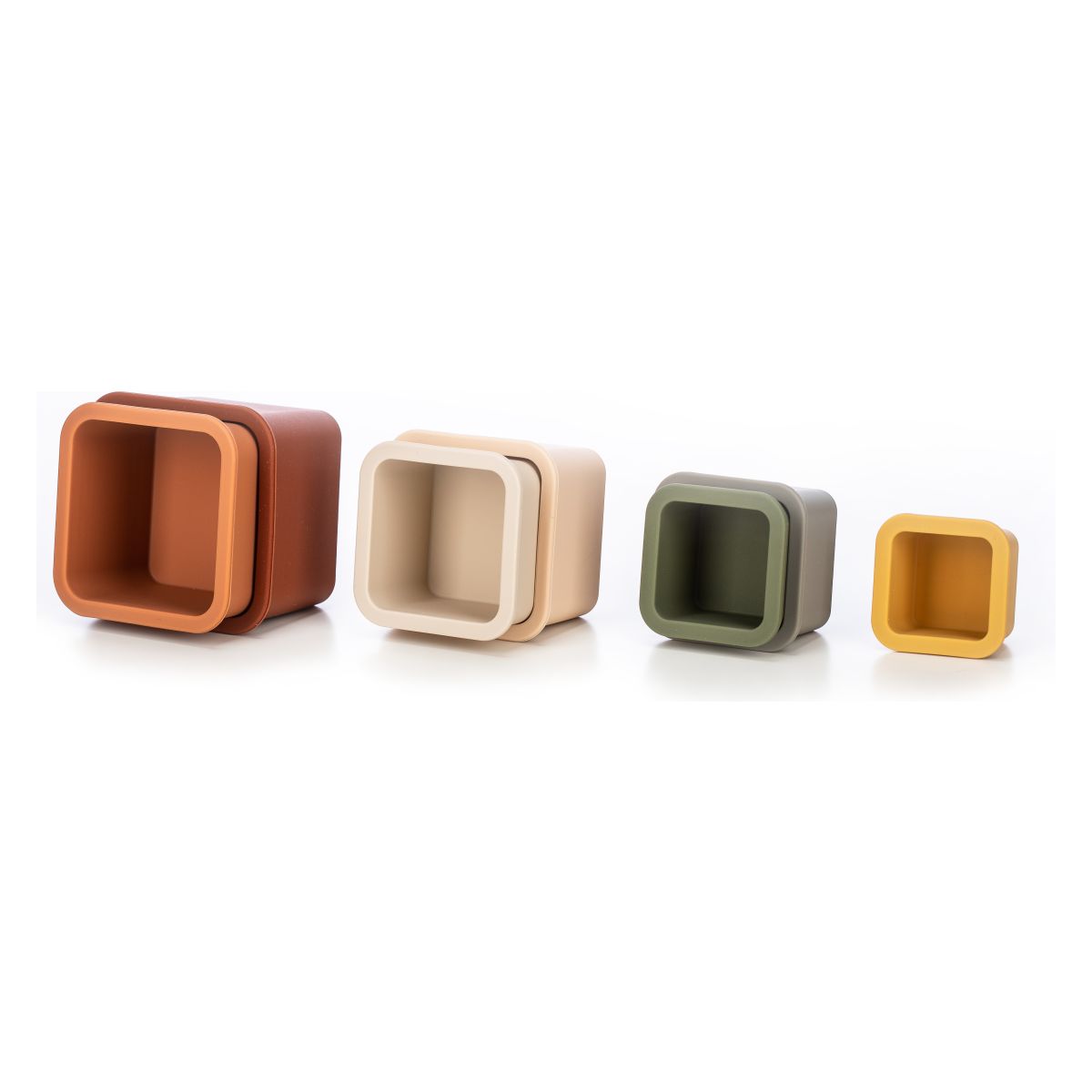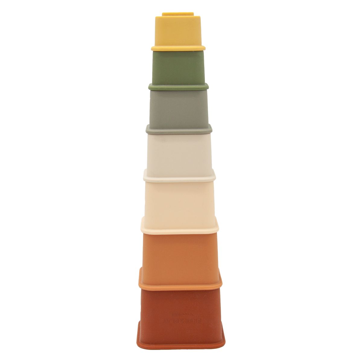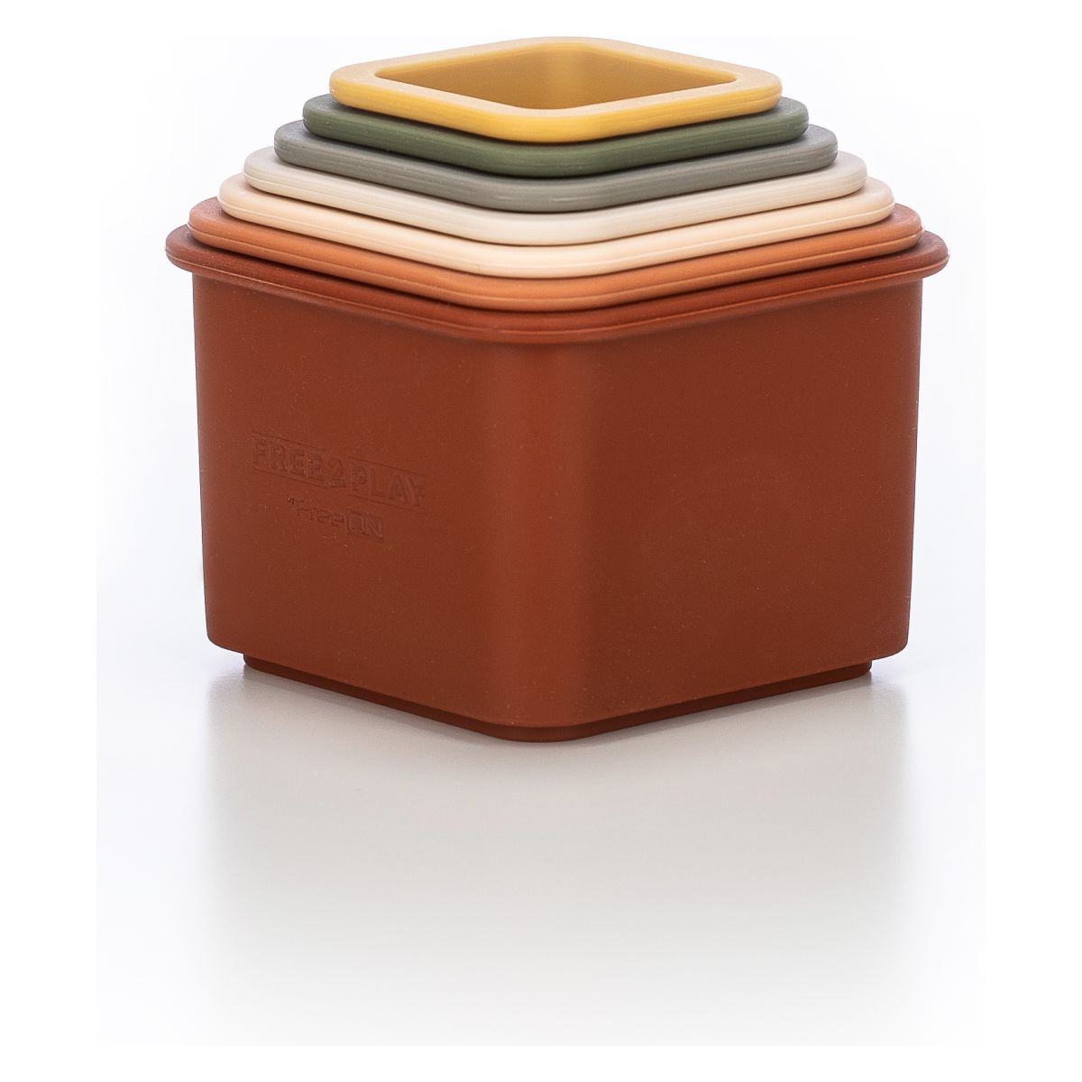 Free2Play toranj iz posudica osmišljen je kako bi potaknuo razvoj kreativnosti i mašte vašeg djeteta, a ujedno je izvrstan alat za treniranje fine motorike. Set sadrži 7 silikonskih posuda kvadratnog oblika, svaka različite boje i veličine. Mogu se slagati jedna na drugu i jedna u drugu. Proizvod je potpuno siguran za vašu bebu jer je izrađen od visokokvalitetnog prehrambenog silikona, ne sadrži BPA, lateks i ftalate te je bez mirisa. Čišćenje kompleta silikonskih posudica potpuno je jednostavno. Može se čistiti toplom vodom i sapunicom ili jednostavno prati u perilici posuđa. Dimenzije sastavljenog tornja: 7,3 x 7,3 x 7,3 cm. Pogodno za djecu od 3 mjeseca nadalje.