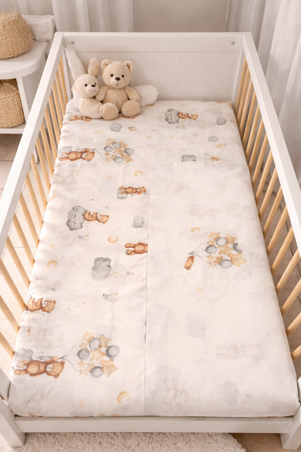 Set posteljine od 100% pamuka pruža nježnost, prozračnost i udobnost potrebnu za miran dječji san. Prirodni materijal nježan je prema koži i omogućuje dobru cirkulaciju zraka.