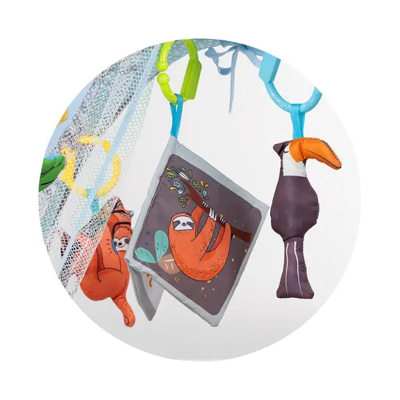 Ova svestrana dječja igraonica s lopticama kombinira zabavu i razvoj u jednom. Mekana podloga za igru s lukovima uključuje razne viseće igračke, ogledalo i šarene loptice, pretvarajući vrijeme igre u avanturu. Pogodno od najranijih mjeseci – za vrijeme igranja na trbuhu, igru na leđima ili kao mini bazen s lopticama za starije bebe.