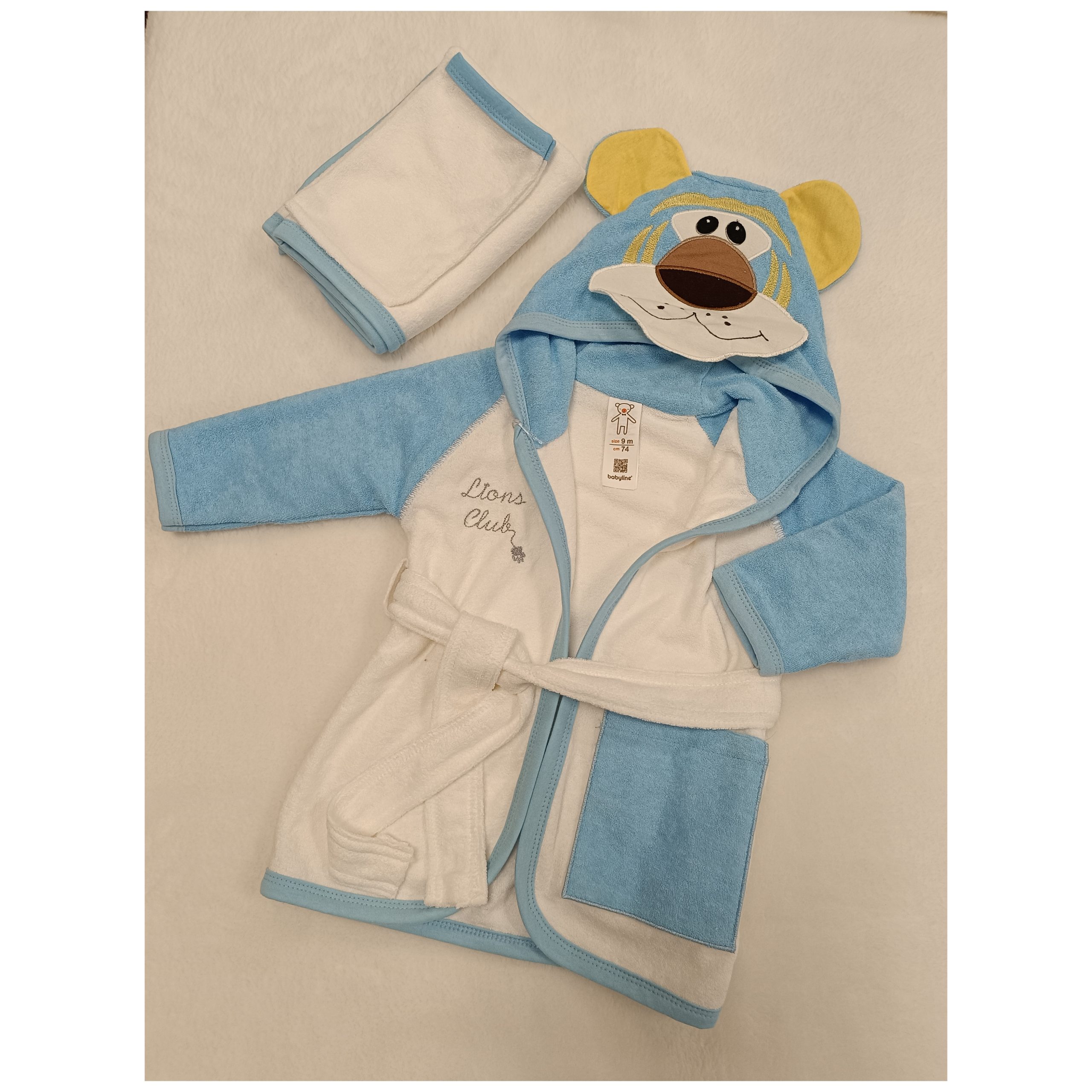 Svaki set za kupanje sadrži ogrtač, ručnik i trljačicu ili krpicu za pranje djeteta.