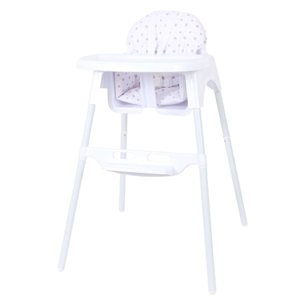 Za dodatnu sigurnost ima 3-točkovne sigurnosne pojaseve. Hranilica se može prilagoditi djetetovoj visini uz pomoć prilagodljivog naslona za noge u dvije visine koji se može i maknuti.