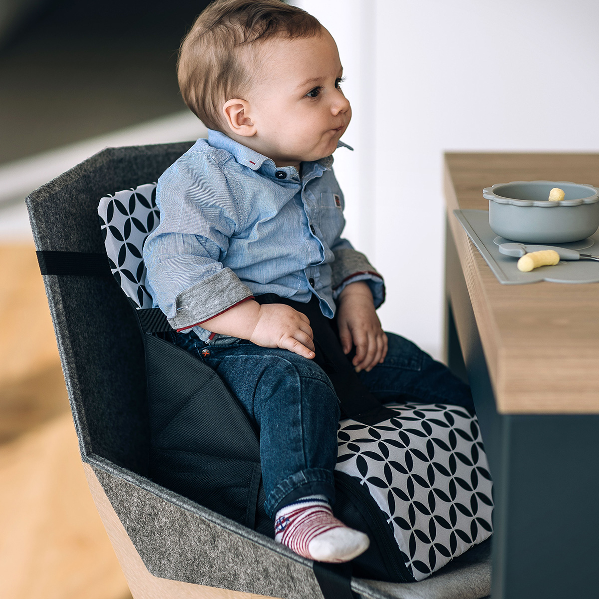 Praktičan dio za sjedenje može se koristiti kao ladica i savršen je za odlaganje pribora. Stolica odgovara većini klasičnih stolaca pomoću dugih sigurnosnih pojaseva podesivih po duljini.