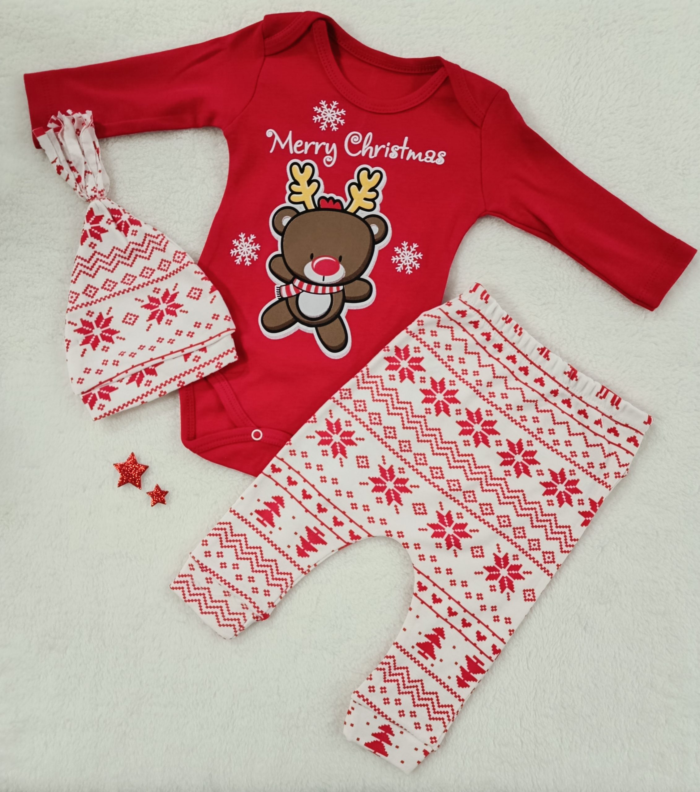 Presladak božićni komplet koji će vašoj bebi donijeti pravi blagdanski ugođaj! Set sadrži crveni bodi dugih rukava s veselim motivom sobića i natpisom “Merry Christmas“, udobne hlačice s nordijskim božićnim uzorkom te odgovarajuću kapicu u istom stilu.