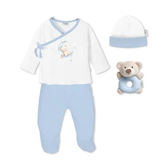 Uključuje sve što vam je potrebno za prve dane vaše bebe: benkica, hlačice sa stopalima, kapu i zvečku.