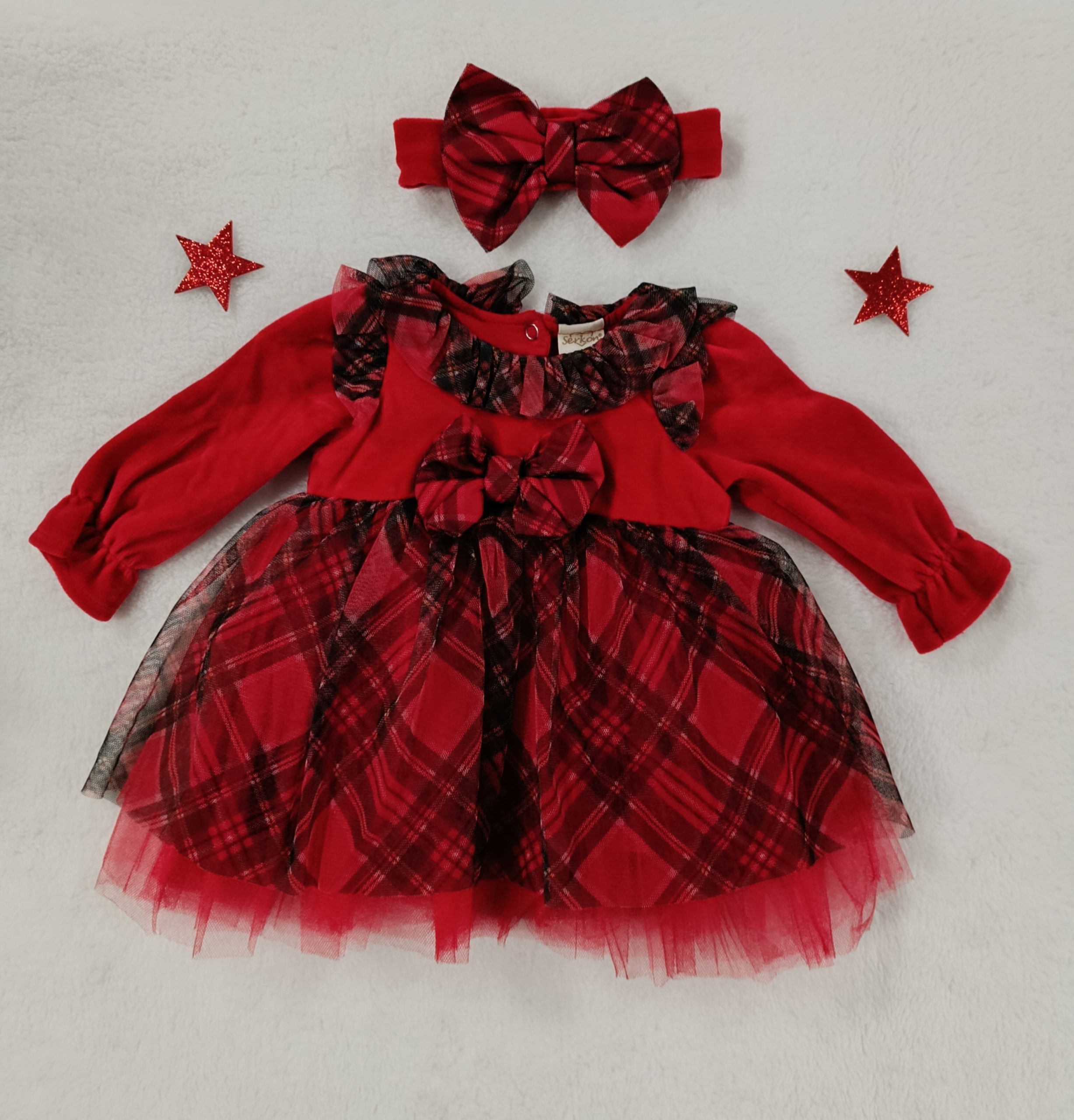 Prekrasna svečana haljinica u crveno-crnom kariranom uzorku, savršena za blagdanske dane, fotografiranja i posebne prilike! Gornji dio izrađen je od mekanog i udobnog materijala, dok raskošna višeslojna suknjica s tilom i kariranim uzorkom daje haljinici poseban, raskošan izgled. Ukrasna mašna na struku i volani oko ovratnika dodatno naglašavaju njen elegantan blagdanski stil.